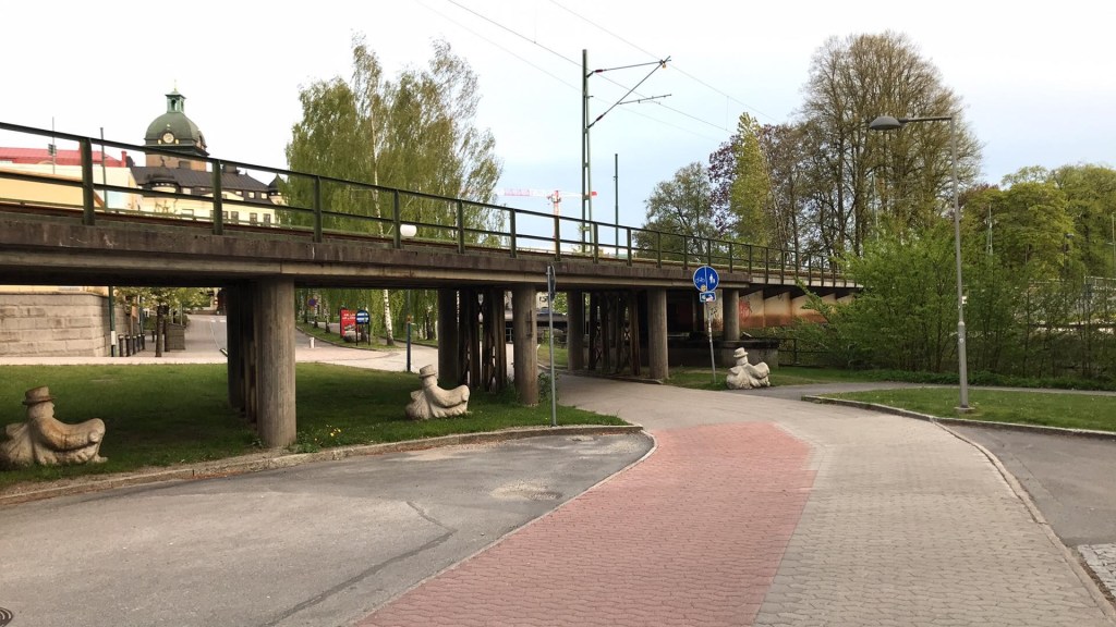 Den mekaniska verkstaden startar 1877 på Norrbygärde nordväst om staden. Kvarteret som den låg i hette Gjutaren. Verkstaden förfogade även över ett gjuteri. Därav namnet Gjutaren som tillkom 1907. Det är i vart fall en trolig förklaring till namnet. Ett antal mekaniska verkstäder fanns i Sverige runt sekelskiftet 1900. Konstruktionen på bilden byggdes alltså 1912 och har nu hängt med i 108 år. På undersidan går det se att åldern börjar ta ut sin rätt. Om jag inte missminner mig har bron fått stadgas upp vid något tillfälle. Vid den här tiden på året är den i vart fall belägen i lummig grönska utmed Viskan.