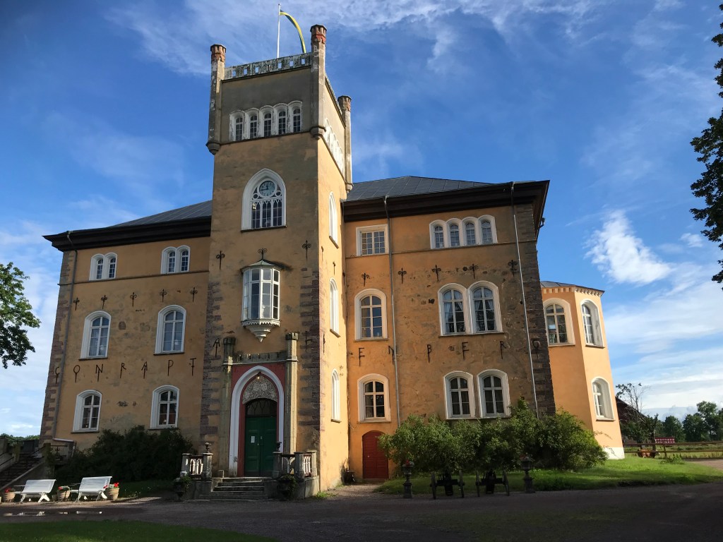 En ljummen lördagkväll kom vi fram till en lummig allé. Tankarna går oundvikligen till den engelska landsbygden. Väl framme mötte slottsherren upp i egen hög person. De bägge trofasta slottshundarna stod vid hans medan han informerade om faciliteterna. Gäster bor i slottets båda flyglar byggda på 1700–talet. Slottet byggdes som sagt om vid 1800-talets mitt. Sägnen säger att Von Falkenberg spökar på slottet. Nattsömnen blev emellertid god, liksom frukosten dagen därpå. Därefter gjordes en liten promenad runt slottsägorna. Slottsherren frågade om vi sovit gott vilket vi hade. Det brukar man göra här sade han. På det stora hela var detta ett slott väl värt ett besök.
