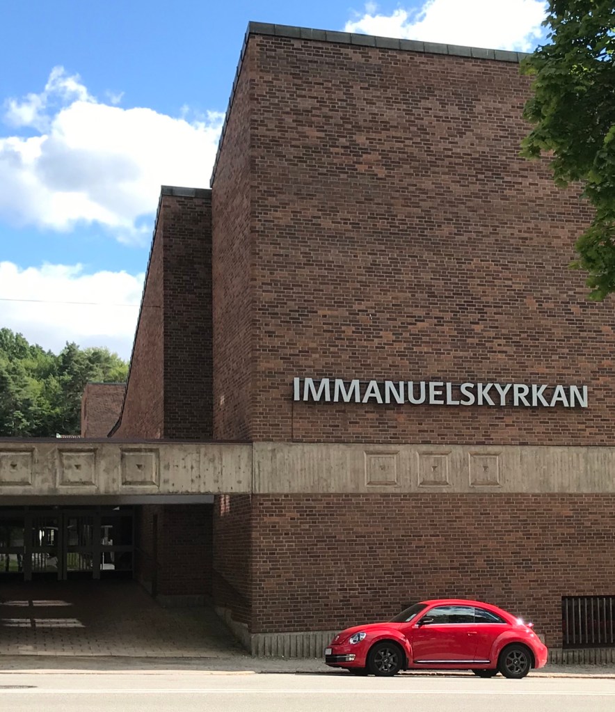 Många gånger har jag passerat denna kyrka och vid några tillfällen har den besökts. Oftast i samband med konserter. Kyrkan på bilden tog ett och ett halvt år att bygga när den stod klar vårvintern 1971. Denna byggnadsstil är typisk för många av de frikyrkor(särskilt equmenia har jag fått för mig). De raka och tydliga linjerna samt det mörkröda teglet. Bland liknande byggnader om än mindre kan missionskyrkan i såväl Fristad som Sjömarken nämnas. Vem som ligger bakom kyrkan på bilden ovan har jag inte funnit någon fakta kring men troligen någon mäktig byggherre. Som ju ofta var fallet under 60 och 70-talet. Utöver gudstjänst lokalen inryms här även en idrottshall som heter Sturehallen liksom bostäder. Om jag inte missminner mig finns här även ett kafé. I alla händelser, oberoende om man är troende eller inte så är Immanuelskyrkan en intressant byggnad med sitt höga tak.