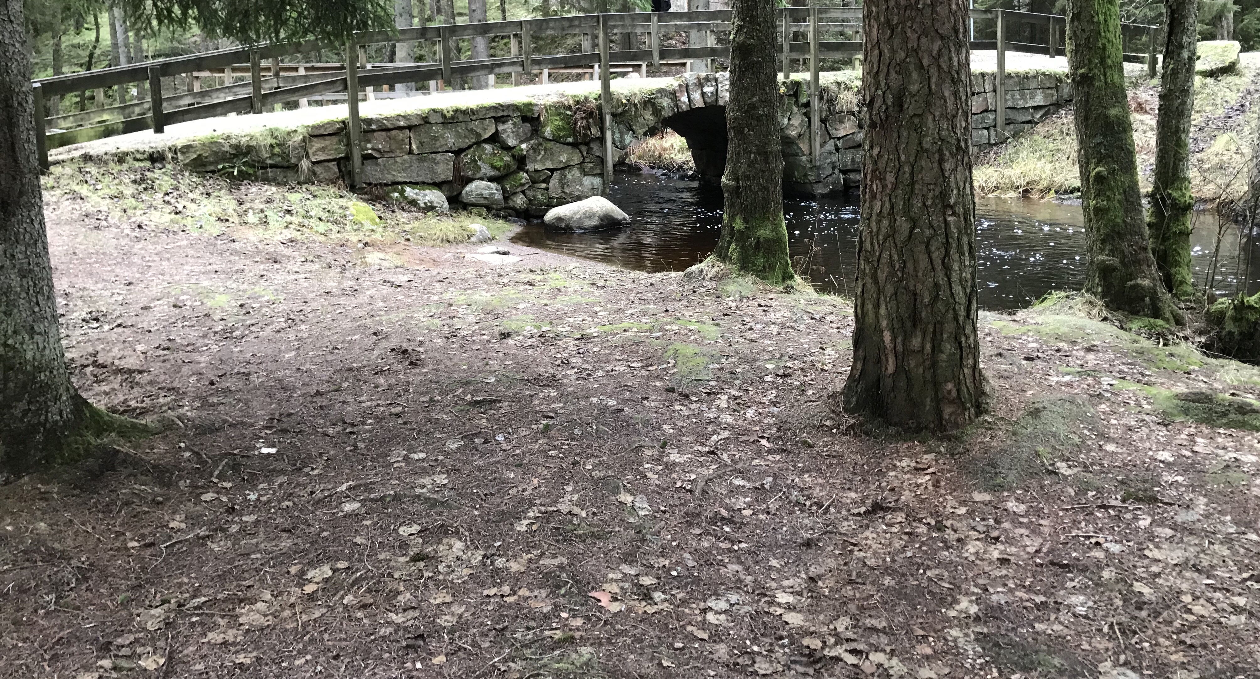 Lördagens promenad gick till Kransmossen som ligger på stadsdelen Trandared i Borås. I goda vänners sällskap gick vi genom den fina urskogen. Lunchen intogs i närheten av den stenbro som syns på bilden ovan. Det är något visst med att äta utomhus. Maten smakar godare på något sätt, även om det bara är några korvar med bröd. I området runt Kransmossen låg byn Hulta Västergården.