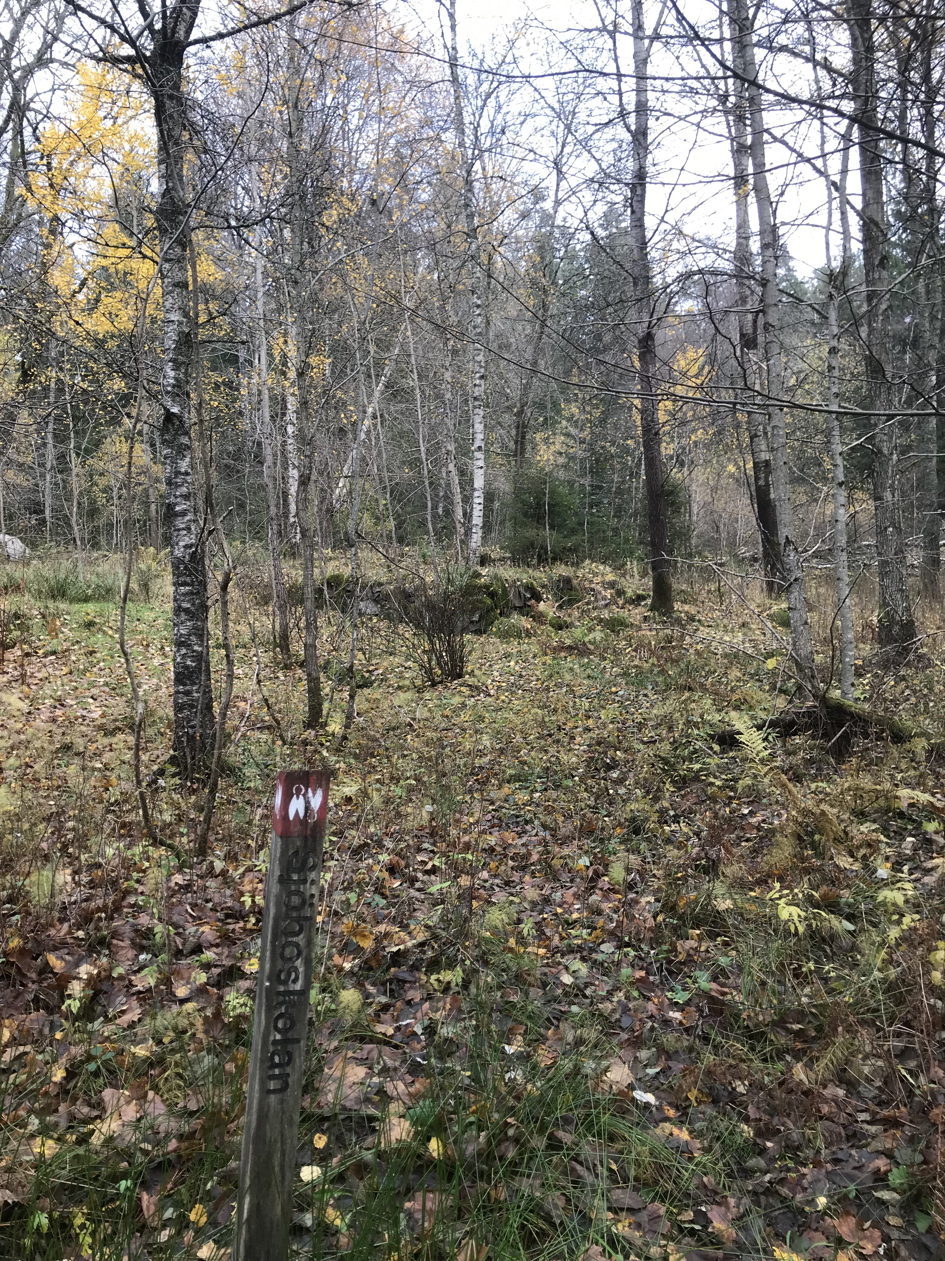 Denna hus eller torpruin hittades i skogen mellan Sjöbo och Kype. Av markeringen på skylten att döma så har en skola delar av skogen som sin skolskog. För några hundra år sedan var denna skog vare sig till för rekreation eller för skolor. Som nämnts i tidigare inlägg fanns i Kypeskogen ett flertal olika torp där folk hankade sig fram trots dåliga möjligheter för jordbruk. Det är rimligt att anta att de som bodde i torpet ovan delvis har fått leva av det skogen bjöd samt fiske och jakt.