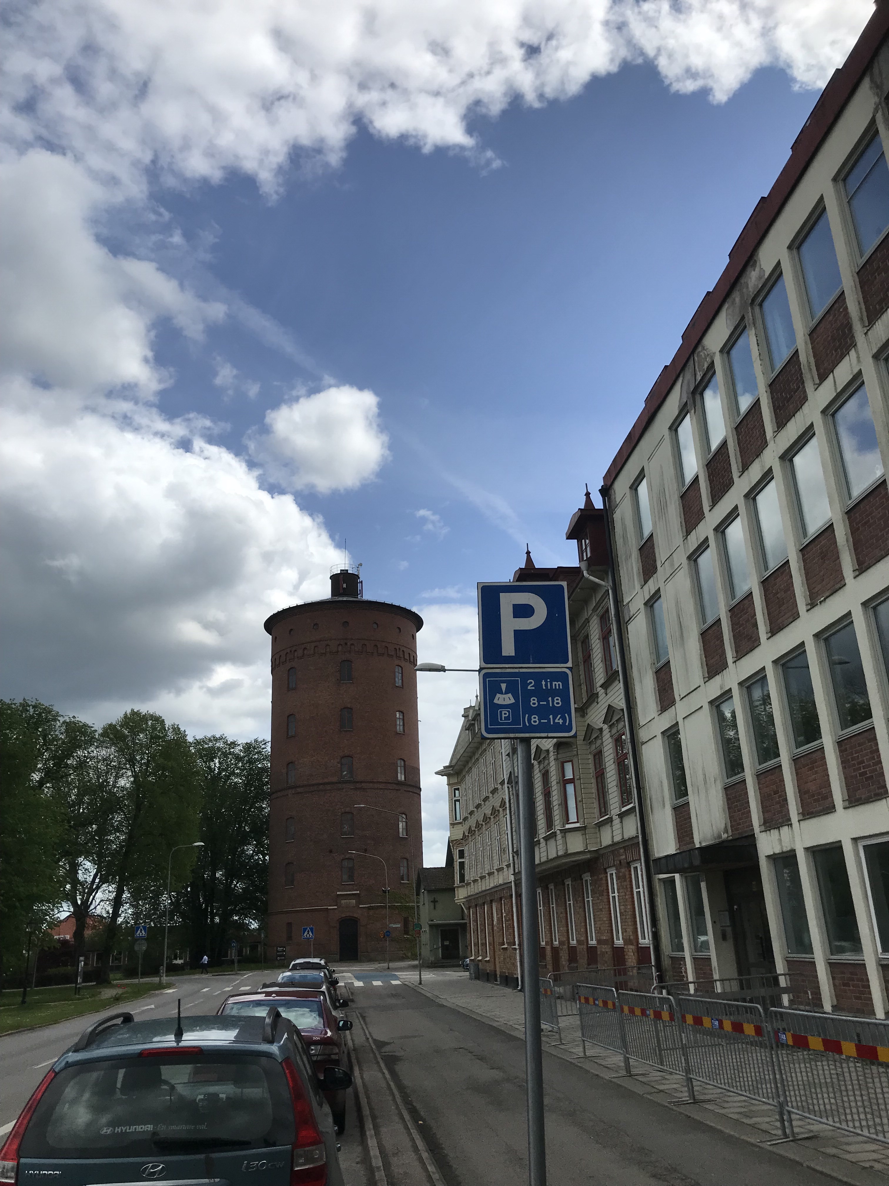 Vänersborg är en vacker liten stad som är belägen precis vid Vänern och Göta älv. Traditionellt sett har Vänersborg varit en viktig handels och sjöfartsstad just på grund av läget vid Vänern. Havren som odlats på Varaslätten fraktades som jag förstått det hit med tåg och själva exporten utgick därefter ifrån hamnen. Exporten av havre hade sin storhetstid vid 1800-talets mitt. Vad är det då för byggnad vi ser på bilden? Jo, det är det gamla vattentornet i Vänersborg vilket byggdes 1882 av byggmästare August Krüger(1822-96). Krüger var ursprungligen ifrån Tyskland men kom att vara verksam i Göteborg. 1882 var tornet 28 meter högt och den första etappen av tornet var således klar. 1911 byggdes tornet ut och kom då att nå en höjd av 43 meter, det måste ha varit en väldigt storslagen byggnation för sin tid. Tornet användes fram till och med sent 1950-tal och ett nytt torn byggdes 1960. I en stad med ständig närhet till stora vattenmassor kan man tänka sig att det gick att samla mycket vatten i vattentornet. Varför tornet på bilden ersattes av ett nytt är dock något oklart men antagligen räckte det gamla tornet inte längre till kapacitetsmässigt. Till sist, Vänersborg är en gemytlig liten stad och ett besök dit rekommenderas!