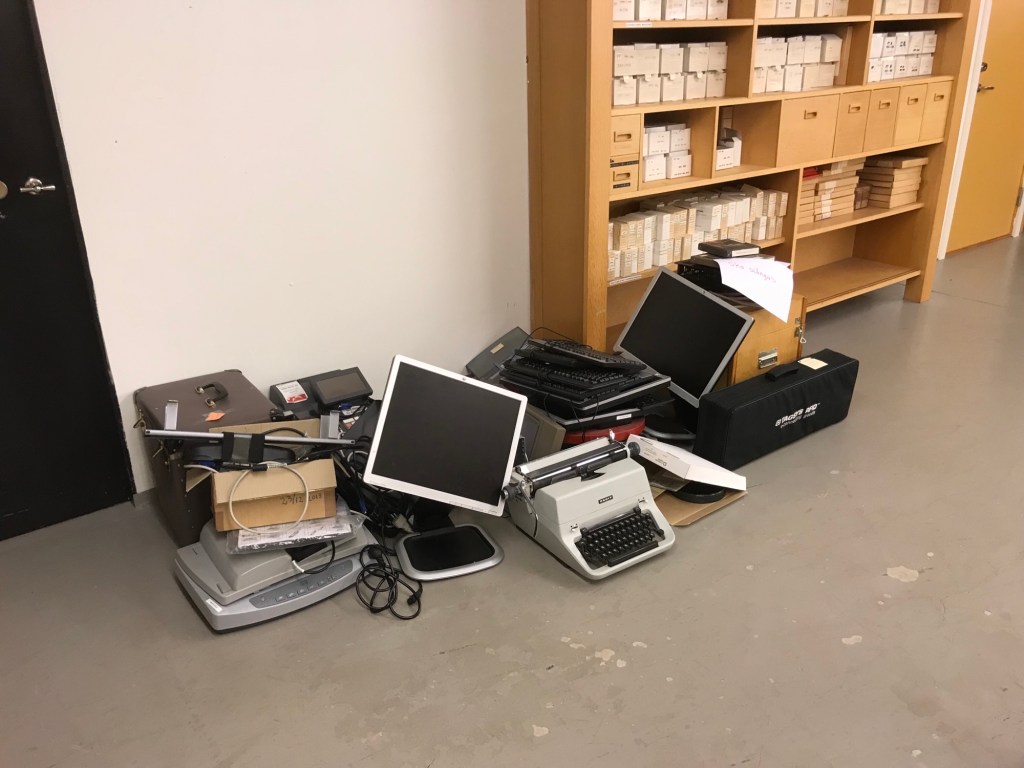 På Falköpings stadsbibliotek finns ett öppet magasin där besökaren kan botanisera bland äldre litteratur, ekonomiska kartor med mera. Den lokala släktforskarföreningen är en flitig användare av lokalen. Det första som mötte mig var en hög med ”slänges”, varav en del prylar inte såg särskilt gamla ut. Som synes var det ganska blandat innehåll men nog gör det lite ont i själen att se en fin Facit-skrivmaskin gå till tippen. Kanske hade någon med tekniskt intresse kunnat få liv i den?